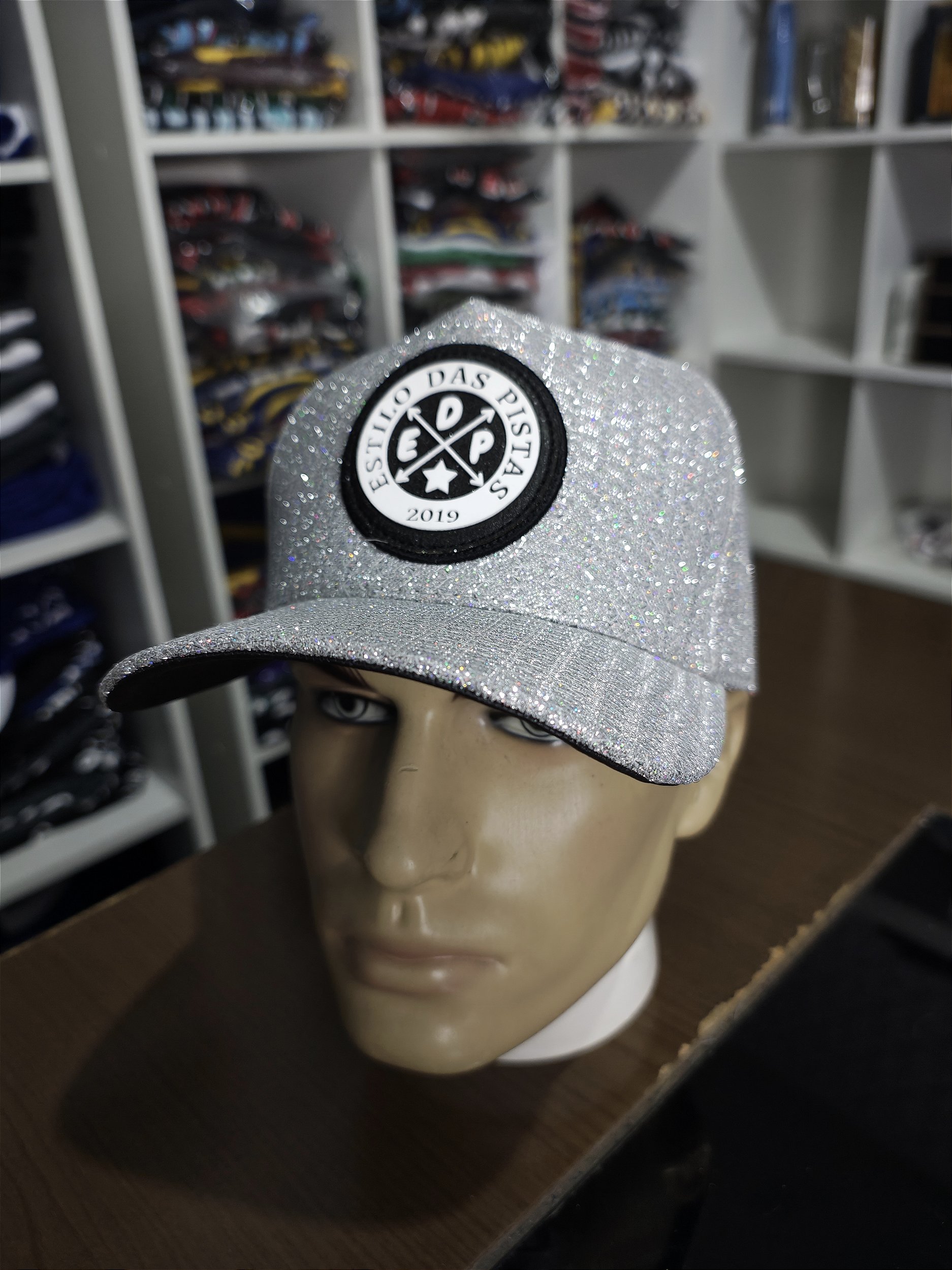 Esse boné é fabricado com tecido especial que brilha e reflete as cores Prateado e branco