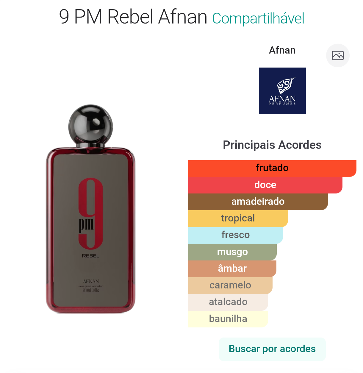 9 PM Rebel de Afnan é um perfume Aromático Frutado Compartilhável. Esta é uma nova fragrância. 9 PM Rebel foi lançado em 2024. O perfumista que assina esta fragrância é Gaël Montero. As notas de topo são: Abacaxi, Maçã Granny Smith e Mandarina. As notas de coração são: Musgo de Carvalho, Cedro e Baunilha. As notas de fundo são: Madeira Seca, Âmbar Cinzento, Caramelo e Almíscar.